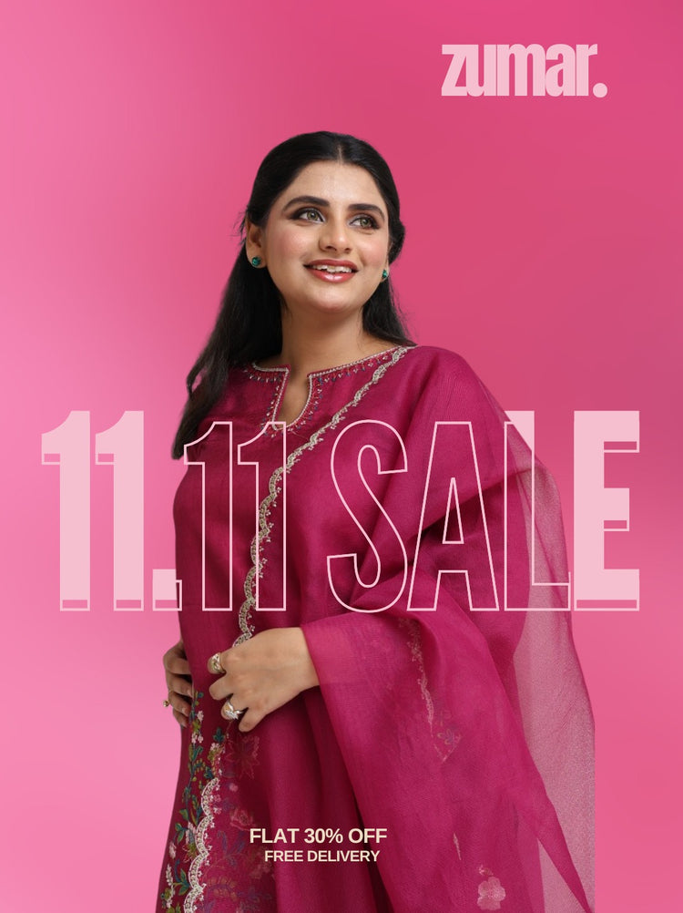 A bold fuchsia pink ensemble in Korean silk featuring an embroidered shirt and dupatta, paired with a matching Farshi Shalwar.