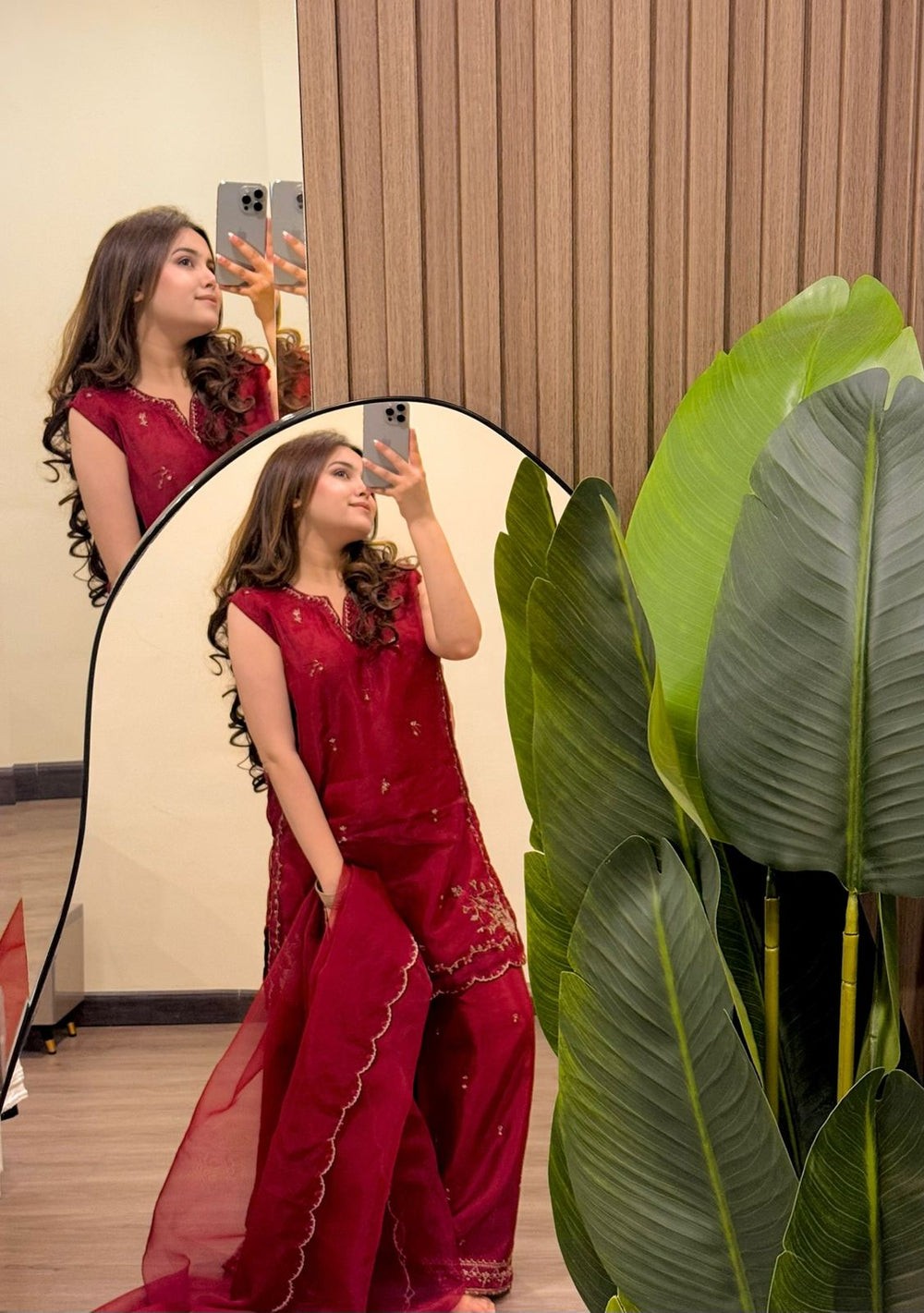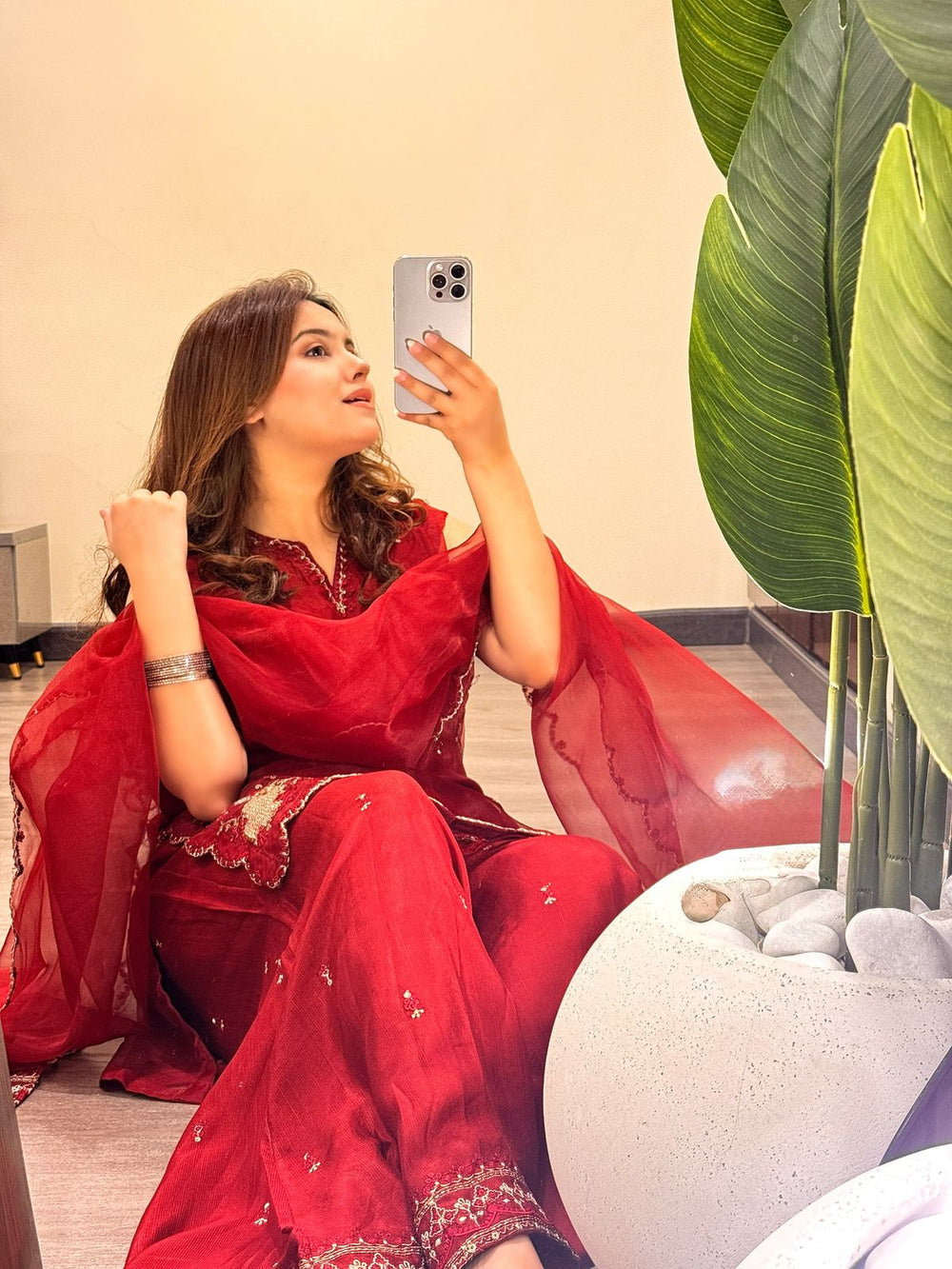Elegant maroon 3-piece ensemble featuring an embroidered organza shirt and matching dupatta, paired with a beautifully detailed raw silk sharara.