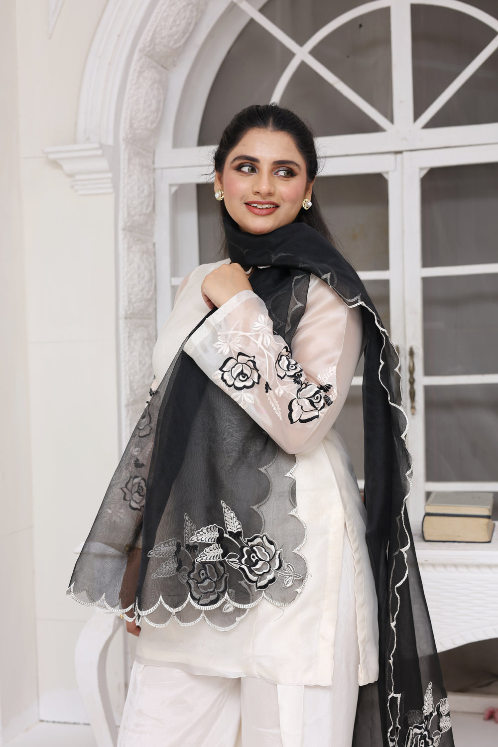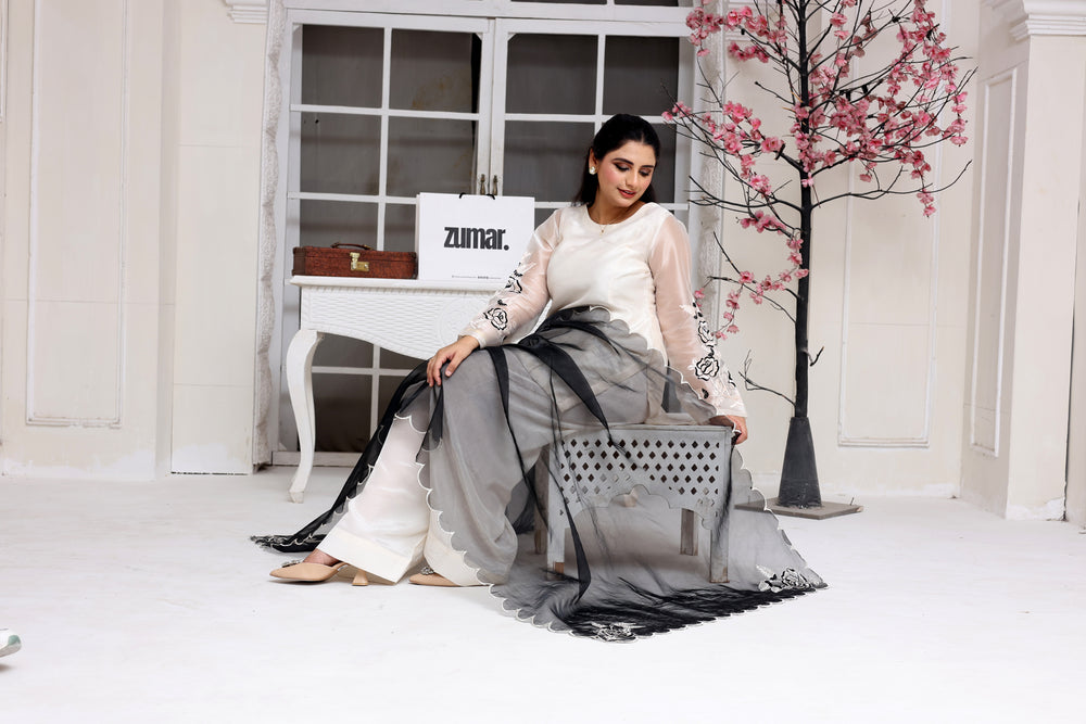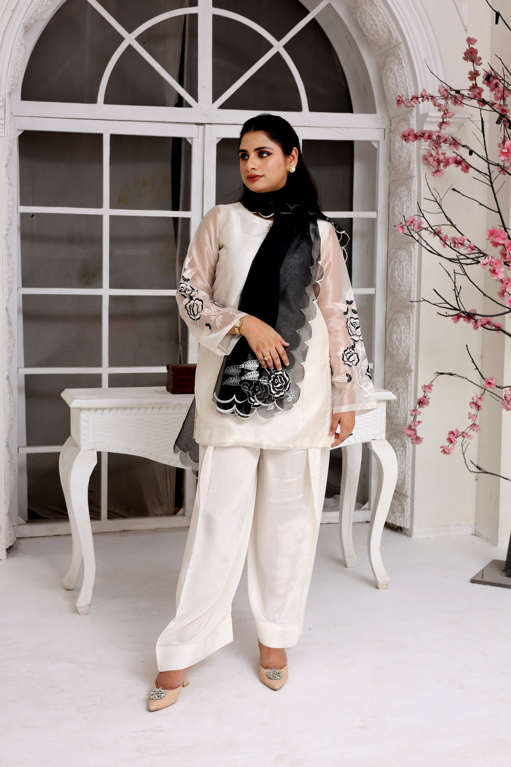 An elegant off-white organza shirt with delicate sleeve embroidery, paired with a matching silk Farshi Shalwar styled with a contrast black embroidered organza dupatta.