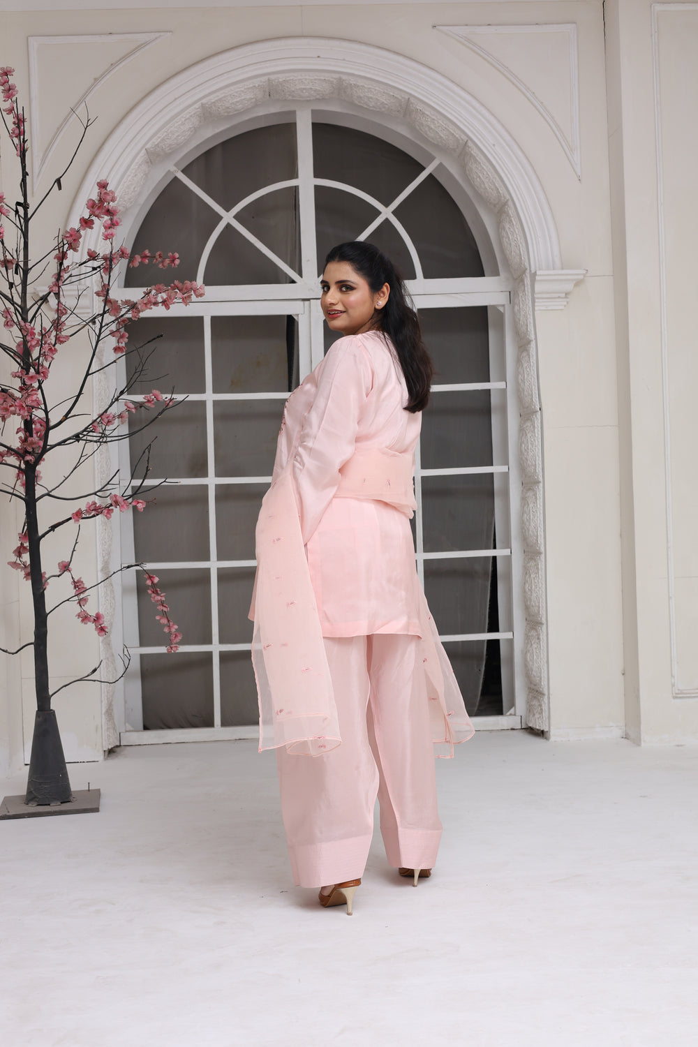 A soft and graceful pink look in tussel silk with delicate embroidery on the shirt and organza dupatta, paired with farshi shalwar.